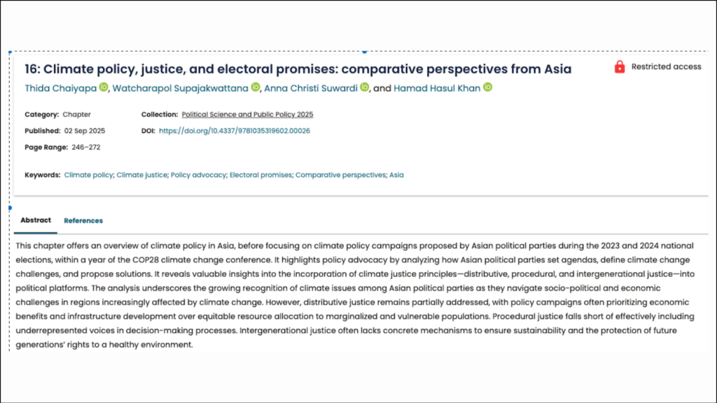 The chapter, written in collaboration with Thida Chaiyapa, Watcharapol Supajakwattana, and Hamad Hasul Khan, examines how climate change is framed within electoral platforms in Thailand, Indonesia, and Pakistan. Through a comparative lens, the authors analyze the extent to which political commitments address the intertwined issues of climate justice, social equity, and sustainable development. The study highlights how electoral promises frequently emphasize growth and development, while justice-oriented concerns, such as protecting vulnerable populations, ensuring intergenerational responsibility, and securing fair burden-sharing, remain inconsistently addressed.